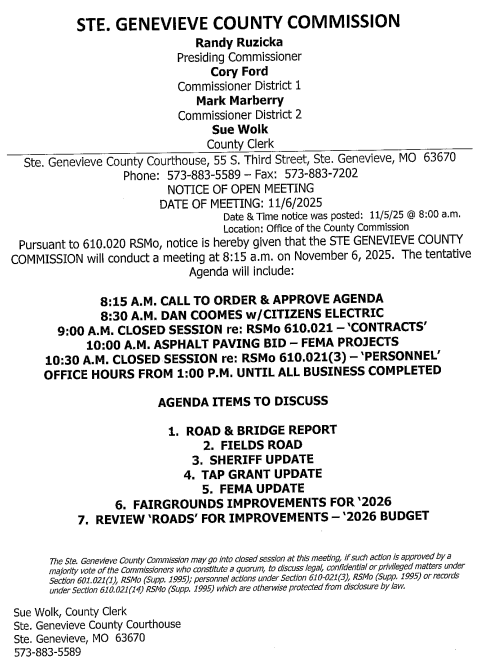 Ste. Genevieve County Commission meets this morning / News, Ste. Genevieve News STE. GENEVIEVE – The tentative agenda for this morning’s meeting of the Ste. Genevieve County Commission has been released. The meeting is open to the public. The agenda: