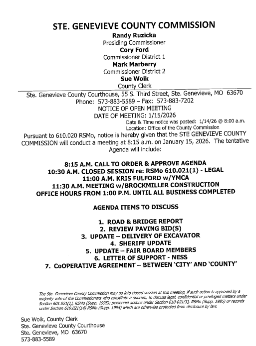 The meeting will beheld in the Ste. Genevieve County Courthouse and is open to the public.