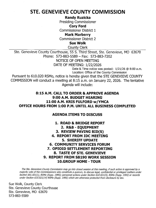STE. GENEVIEVE – The Ste. Genevieve County Commission meets this morning at 8:15 a.m. at the Ste. Genevieve County Courthouse.