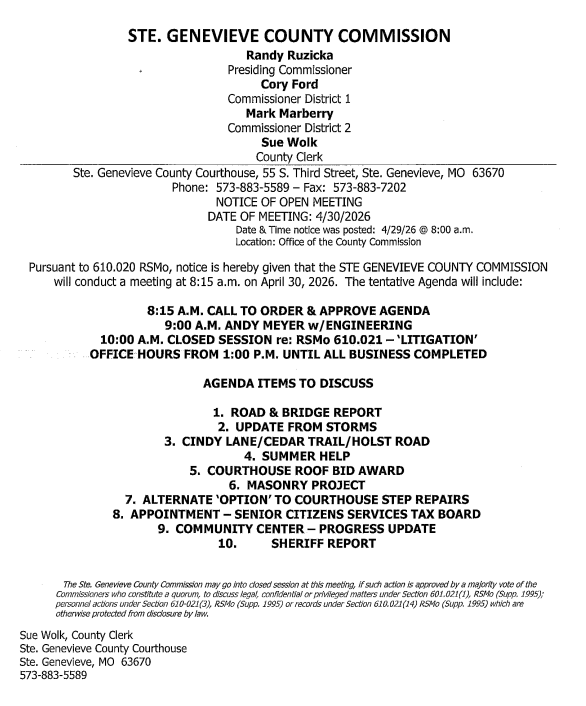 Ste. Genevieve County Commission to meet this morning