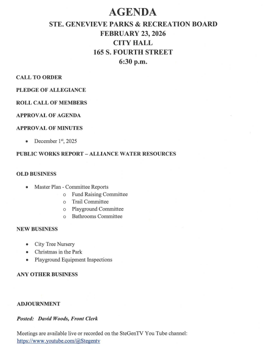 Ste. Genevieve Parks and Recreation Board will meet Monday / News, Ste. Genevieve News STE. GENEVIEVE – The Ste. Genevieve Parks and Recreation Board meets Monday at 6:30 p.m. in the city hall board room, 165 S. Fourth Street, Ste. Genevieve. The meeting is open to the public. The tentative agenda: The complete park board meeting packet: SG PARK BOARD AGENDA PACKET