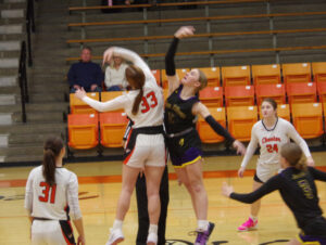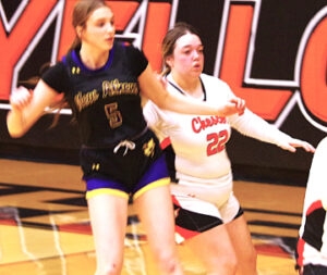 Chester’s Natalie Guetersloh (22) sees action in the game against New Athens Tuesday January 6. it was a special night for her as it as her 18th Birthday. She and her team won, 65-24, to put a great ending to her special day! Jim Beers Photo