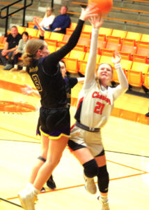 Lady Jacket senior, Lillian Diskey (21), goes up against two New Athens defenders Tuesday January 6 in Chester’s first game of the 2026 Lady Jacket Mid-Winter Classic Tournament. In the 65-24 win, Diskey scored 8 points and played good defense. She knocked down 1 3-pointer, two 2-pointers, and 1-of-2 free throws in the win. Jim Beers Photo