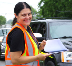 Carrie Eggemeyer, Program Manager, checks clients in at the first stop in the delivery process. From her station vehicles were directed to the driveway leading to the CHS kitchen-bus porch area where staff greeted them and loaded their food items in their vehicles. Jim Beers Photo