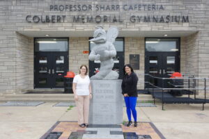 District # 139 Superintendent Kimberly Briggs (left) and Carrie Eggemeyer, Program Coordinator/Manager (right), pose for a quick photo in front of the James F. Sharp Cafeteria at Chester High School. That is the location where the 2025 USDA “Sun Meals To-Go” program was housed and implemented throughout the summer of 2025. Briggs was instrumental in finding and creating the program and Eggemeyer was the Summer of 2025 Program Manager. Throughout the summer the program provided 9.100 meals each week to program recipients. Jim Beers Photo