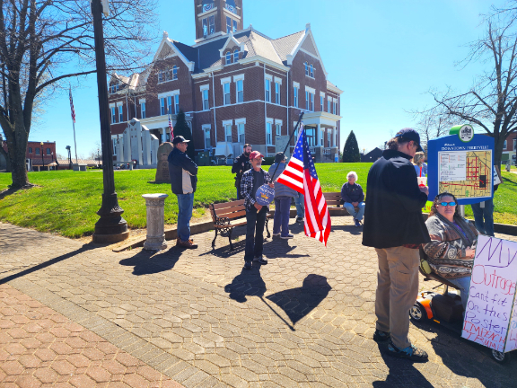 PERRYVILLE – Approximately 20 dedicated Americans stood for democracy on the courthouse Square in Perryville and in Cape Girardeau at the Liberty Corner of Capaha Park over 800 stood jubilantly waving flags, carrying signs and spreading the word that we can take back our nation from warmongers, oligarchs, grifters and the corrupt and oblivious.