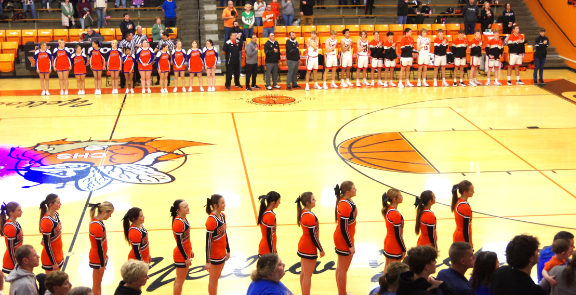 is Players, Cheerleaders and fans stand at attention for the playing of the National Anthem, “The Star Spangled Banner” at the start of the Chester vs Okawville game Friday December 12, 2025. The CHS Pep Band performed the Anthem under the direction of Steve Colonel, CHS Band Director